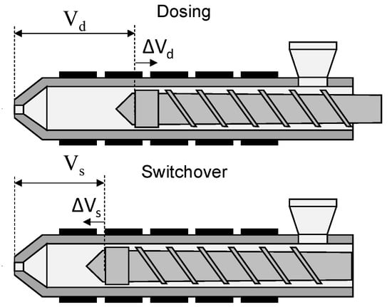 To visualize the volumetric deviations, ΔVd was calculated as the deviation of the screw position at the end of metering to the set dosing volume and ΔVs as the deviation of the screw position at the end of injection to the set switchover volume. Figure 7 shows a schematic representation of the screw positions. Positive values of ΔVd and ΔVs lead to an increase in the injected volume.
