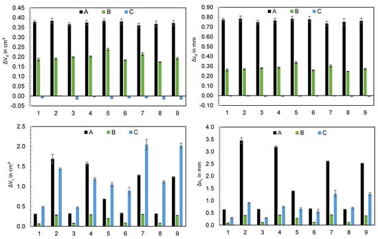 The computed values for the deviations of the dosing and switchover volumes as well as the screw strokes s calculated from these values are visualized in Figure 8. The values ΔVd resp. Δsd show that the hydraulic machines A and B meter more material than set, with machine A showing the highest deviations. In contrast, machine C meters almost exactly the set dosing volume. When considering ΔVs, machine B shows the greatest precision in approaching the switchover volume, with machines A and C exceeding the switchover point even more. Converted into screw stroke, machine A shows the strongest overrun in the majority of machine settings.