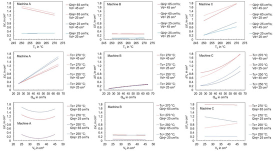 In addition, Table A4 lists the regression equations for describing ΔVs, which represents the deviation of the screw position from the switchover volume. The regressions were used to visualize the effect diagrams shown in Figure 9.