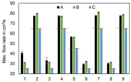 Maximum of the flow rates depending on the parameters of the experimental design and the machine (n = 6).