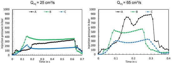 In addition to the screw positions and flow rates, the resulting injection pressures were evaluated. The resulting injection pressures, two operating point examples of which are shown in Figure 14, show significant differences. It is apparent that the machine has a significant influence on the injection pressure profile depending on the respective operating point.