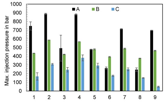 The maxima of the injection pressure curves depending on the parameters of the experimental design, shown in Figure 15, demonstrate a clear dependence on the setting of the injection molding machine and also the machine type. The reasons why the injection pressures sometimes vary significantly (e.g., test points 1 and 3 when using machine A) may be due to material fluctuations or plugs.