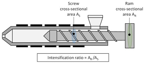 One explanation for the difference in injection pressures is the intensification ratio (IR). The IR describes the pressure intensification between the hydraulic pressure applied and the specific pressure in the screw antechamber (Figure 16) [31]. Usually, the applied hydraulic pressure affects a larger cross-sectional area inside the piston than the specific pressure in the screw antechamber. As a result, a specific intensification ratio is obtained for each injection molding machine.