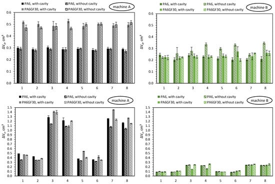 In the following paragraphs, the focus will be exclusively on the machine-specific behavior of machines A and B when setting the dosing and switchover volumes while varying the polymer and the cavity. Figure 17 visualizes the measured deviations from the dosing volume ΔVd and switchover volume ΔVs when using unreinforced polyamide (PA) and reinforced polyamide with a glass-fiber content of 30% (PAGF30), when injected into a cavity (with cavity) and into the atmosphere (without cavity).