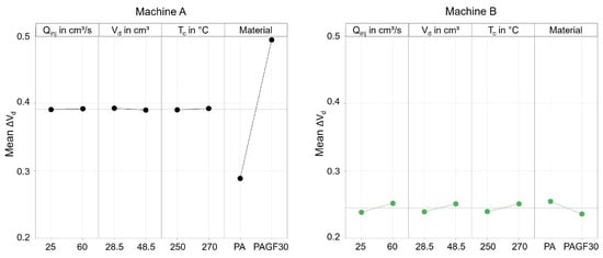 Figure 17 already shows that there are significant differences between the machines when processing different materials. Due to the large number of the investigated influencing variables, the main effects are shown in Figure 18 and Figure 19.