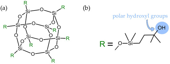 General structure of closed-cage substituents (R) might be of the same chemical nature or they can vary (a), and structure of the substituents in the octa(3-hydroxy-3-methylbutyldimethylsiloxy) POSS used in this study (b).