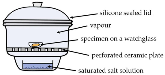 Schematic representation of specimen conditioning in a desiccator over saturated salt solutions.
