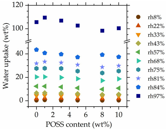 Water uptake as a function of the POSS content at all studied rh levels.