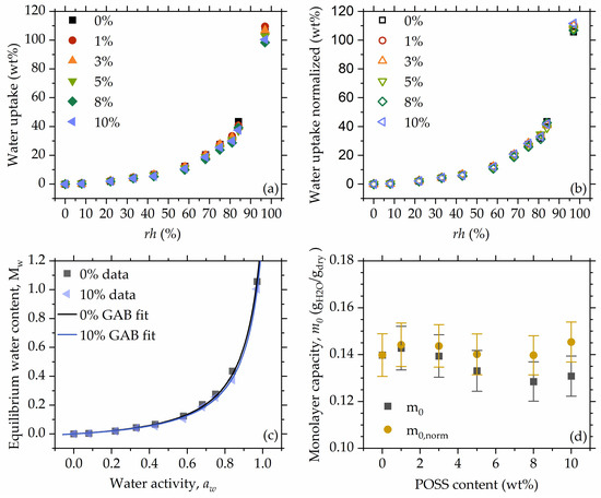 Figure 4 shows the water uptake as a function of POSS, recorded at all rh levels. With increasing relative humidity, water uptake differences between rh levels become more pronounced, showing that already-absorbed water increases the materials’ affinity towards water vapor. At low rh levels, no differences in the water absorption of specimens with different POSS contents are observed. At high relative humidities (>68%), slight differences emerge; however, their nature is not monotonous, and the observed differences in water uptake are rather small. Therefore, it can be concluded that 8OHPOSS does not hinder the water absorption of the studied materials, even at high POSS contents (10 wt%). This might originate from hydration sites still being accessible to water molecules, even at high POSS loadings. The addition of POSS of course reduces the number of NIPU-originating hydration points per unit mass; however, the effect is small (~10%) and likely compensated to some extent by the introduction of hydroxyl groups residing on the vertex groups of POSS. We will further follow this point with a formal analysis of equilibrium sorption isotherms.