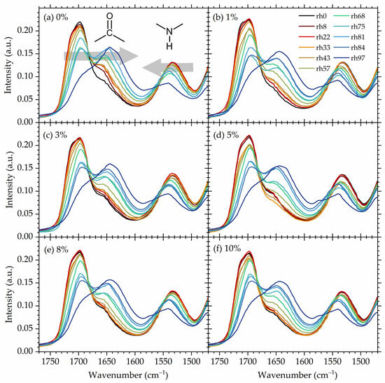 Upon water uptake (upon an increase in the rh level), the free C=O component gradually vanishes, while two other components shift towards a lower wavenumber (redshift). The shift towards a lower wavenumber of stretching modes indicates the formation of new hydrogen bonds and/or the strengthening of the already existing HBs [91,92,93]. In this study, the red shift in C=O stretching modes upon water absorption is related to the formation of water–polymer hydrogen bonds that either replace the polymer–polymer HBs (breakage of C=O⋯H-N hydrogen bonds and formation of C=O⋯H2O resulting from competition between water O-H and amide N-H for C=O acceptor sides [94]) or are formed as additional hydrogen bonds. In both cases, the resulting hydrogen bonding of C=O becomes stronger since hydroxy moieties form with carbonyl stronger hydrogen bonds in comparison to NH groups. The stronger hydrogen bonding of C=O⋯H-O compared to C=O⋯H-N results from the higher polarity of the OH bond compared to the NH bond [95]. The strength of hydrogen bonds influences the strength—the bigger the shift, the stronger the hydrogen bonding [96,97,98,99].