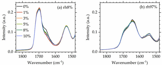 The carbonyl stretching region exhibits a complex nature with three main component bands overlapping, as is also usually observed for conventional polyurethanes [88,89,90]. Here, the components in the carbonyl stretching region are as follows (locations given in relation to the spectra of dry materials): 1720 cm−1 corresponding to the free carbonyls (i.e., non H-bonded), 1700 cm−1 corresponding to the weakly H-bonded ones, and 1660 cm−1 corresponding to the strongly H-bonded carbonyls (e.g., forming two or more hydrogen bonds) [58].