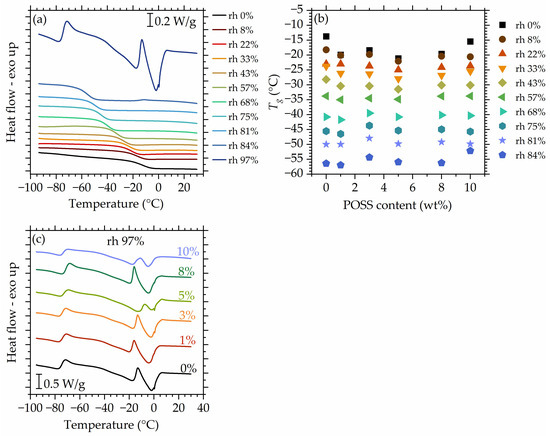 DSC curves recorded for the matrix at all studied hydrations. (a) Glass transition temperature as a function of the POSS content for materials studied at values up to 84% (b), DSC curves recorded for all studied materials after conditioning at 97% (c). Data for dry materials are taken from Ref. [56].