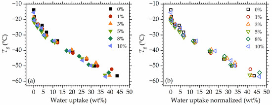 as a function of water uptake (a) and water uptake normalized to the polymer mass (b).