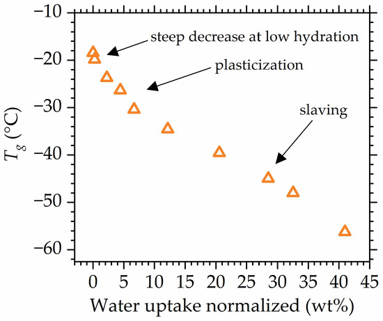 Plasticization is observed in low to medium hydrations; however, at high relative humidities, another effect seems to impact the mobility of polymer–water systems. At high hydrations, when the amount of absorbed water is high enough for bulk water to be formed, the water gains its own mobility. As a result, water mobility now determines polymer mobility in a sense that the dynamics of bulk water and dynamics of polymer are now coupled and the observed glass transition of the systems is a result of cooperative motion between two components that possess their own dynamics [113]. Therefore, water possessing it own mobility drives reduction in a different manner than in the case of plasticization, which is seen as a pronounced change in slope in the data points (Figure 11). The above is referred to as slaving, since polymer mobility is “slaved” by bulk water [112,114,115,116,117].