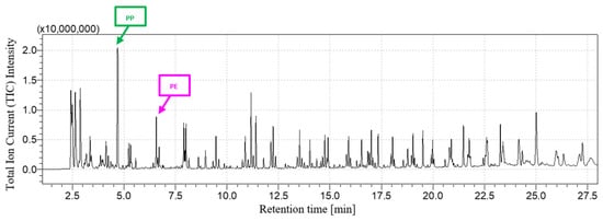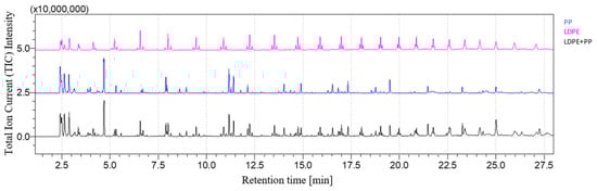 Figure 1 and Figure 2 show, respectively, the LDPE + PP chromatogram and its comparison with the LDPE and PP chromatograms. At a retention time equal to 4.74 min, the peak related to 2,4-dimethyl-1-heptene, the main pyrolysis product of PP, is detected, as well as 1-decene after 6.61 min associated with LDPE. As highlighted by Figure 2, the resulting chromatogram is the combination between the chromatograms of LDPE and PP taken individually.