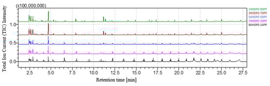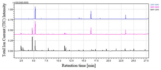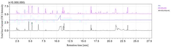 All other mixtures’ chromatograms and their comparison are reported in the Supplementary Materials (Figures S1–S29). In all cases, the benchmarks for each polymer, as reported in Table 4, are clearly recognized.