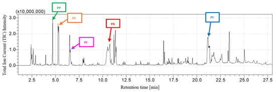 Mass spectrometry analysis techniques provide complementary solutions to identify single polymers and to detect them in mixtures and blends, which is the aim of this study by using py-GC/MS. The operation of this technique is widely known in the literature [52,53,54]; it is characterized by a pyrolizer, which initially degrades large molecules into smaller ones in an inert atmosphere (in this case, helium) and it generates volatile degradation of characteristic products, which will be separated into a GC column made of copper with a stationary phase made of silica. This will lead to a fingerprint of the products, the chromatogram. Later, the spectrometric detection results in a mass spectrum, typical of the volatile residues caused by MS [55]. This technique is able to boost the sensitivity of the analysis, even when dealing with samples from complex environmental matrixes, and it can be combined with other methods, such as atomic force microscopy-based infrared spectroscopy (AFM-IR) [56] or µ-FTIR [57] in order to gather insights about micro- and nanoplastics’ size and shape, since this information is lost during pyrolysis along with number of particles [58] due to the fact that this characterization method is destructive and may alter the chemistry of the samples [59].