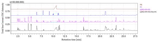 Figure 5 and Figure 6 show, respectively, the LDPE + PP + PS + PA + PC chromatogram and its comparison with the LDPE + PP + PS + PA and PC chromatograms. As shown in Figure 5, the reference pyrolysis products of each polymer can be identified without overlapping between peaks related to LDPE (1-decene with retention time equal to 6.61 min), PP (2,4-dimethyl-1-heptene with retention time equal to 4.74), PS (styrene with retention time equal to 5.38 min), PS (ε-caprolactam with retention time equal to 10.80 min) and PC (2,2-bis(4′-methoxylphenyl)propane with retention time equal to 21.2 min). The resultant chromatogram is the set of any polymer or mixture, as highlighted in Figure 6.
