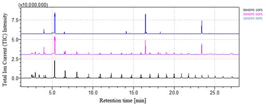 Figure 8 shows the comparison between the chromatograms of 90HDPE-10PS, 50HDPE-50PS and 10HDPE-90PS. As expected, PS peaks’ areas increase with higher weight percentage of PS in the blend, while the heights of the HDPE peaks diminish. Qualitative analysis is always possible for both HDPE and PS.