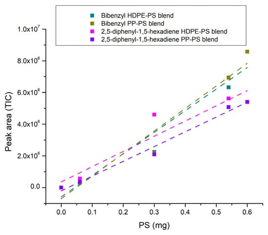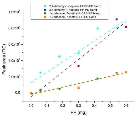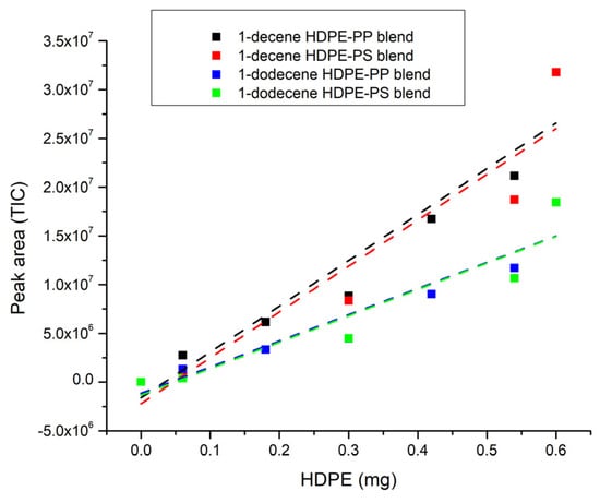 After collecting the experimental data on blends, the peak area of the characteristic markers for HDPE, PP and PS is reported as a function of percentages by weight transformed into milligrams of the blend’s constituents (Figure 10, Figure 11 and Figure 12) so as to establish the correlation between them and to calculate the LOD and LOQ for each polymer starting from the standard deviation of the intercept and the value of the slope of each calibration curve. The values of the peak areas of 1-decene, 1-dodecene, 2,4-dimethyl-1-heptene, 7-methyl-1-undecene, bibenzyl and 2,5-diphenyl-1,5-hexadiene in different types of blends are reported in the Supplementary Materials (Tables S1–S3).