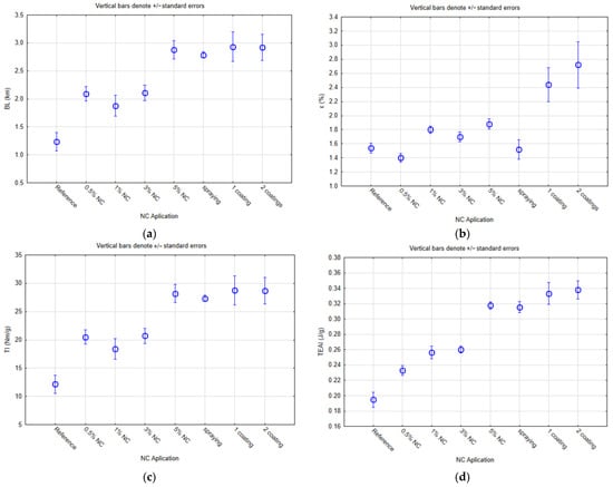 Table 4 shows the analysis of the homogenous groups based on the mean values of TI and TEAI. In the case of the TI characteristic, based on the statistical evaluation, identical homogeneous groups were formed as in the case of the BL characteristic shown in Table 3. On the other hand, in the case of TEAI, more homogeneous groups were formed based on the statistical evaluation using significance levels than in the previous case. The specific difference was that the paper with a 1% addition of nanocellulose was classified into two homogeneous groups based on the comparison of the significance levels. However, even here, a more significant statistical difference compared to the reference was achieved by the homogeneous group with the paper with a 5% addition of nanocellulose with the application of the nanocellulose by spraying, and both methods of coating the nanocellulose on the paper.