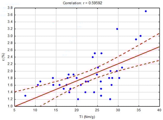 In Figure 2 and Figure 3, it is possible to see the correlations between the selected characteristics. Based on the obtained results, the correlations of the selected characteristics with a 95% confidence interval were performed. Figure 2 shows the correlation between the relative elongation and the tensile index. Based on the absolute correlation r = 0.59592, this is a moderate positive dependence, i.e., as the relative elongation increases, the tensile index also increases with a moderate positive dependence.