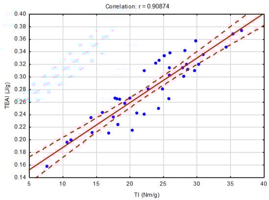 Higher absolute values of the correlation index (r = 0.90874) were achieved for the correlation between the tensile work absorption index and the tensile index. In this case, it was a very strong positive correlation, i.e., when the tensile work absorption index increases, the tensile index will also increase with a very strong dependence.