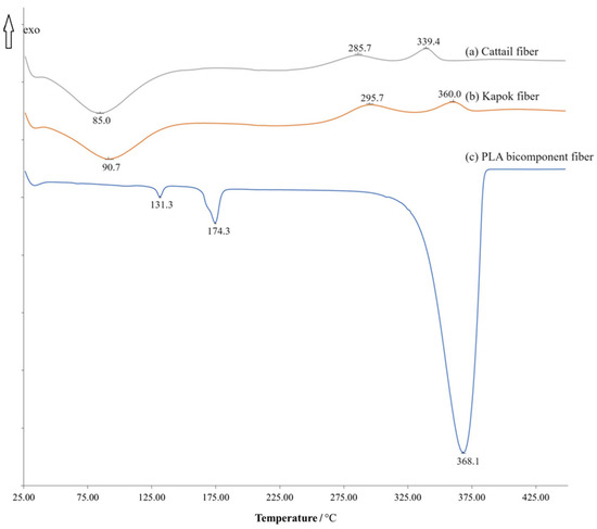 DSC thermogram for (a) cattail fiber, (b) kapok fiber, and (c) PLA bicomponent fiber.