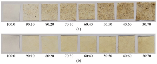 Appearance of the PLA composite with natural fiber at different ratios: (a) PLA: cattail fiber; (b) PLA: kapok fiber.