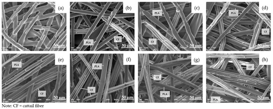 SEM images of PLA: cattail fiber composite webs at ×500 magnification: (a) 100:0; (b) 90:10; (c) 80:20; (d) 70:30; (e) 60:40; (f) 50:50; (g) 40:60; (h) 30:70.