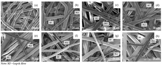 At this specific hot press temperature, the core of the PLA bicomponent remained solid, preserving the fibrous structure instead of forming a film-like structure. Meanwhile, the molten PLA sheath possessed adhesive properties, enabling it to adhere to neighboring fibers. As the proportion of natural fiber increased, the presence of PLA bicomponent fibers diminished (Figure 4 and Figure 5). When the natural fibers ratio exceeded 50%, it became challenging for the PLA to retain both natural fibers. Consequently, the composite webs might exhibit the fluffiness characteristic of natural fibers at this stage (Figure 3). This was consistent with the findings from Mula et al. [8], which similarly suggested that milkweed content should not exceed 50% due to lower mechanical properties. Jamat et al. [45] developed a kapok-fiber-reinforced polyvinyl alcohol biocomposite and found that the tensile strength and elastic modulus increased with up to 30% kapok fiber content but decreased when the kapok fiber content reached 40%. Additionally, Lee et al. [46] found that incorporating 60 wt% of silk fiber resulted in decreased flexural properties in the biocomposite. This decline was attributed to inadequate filling of the molten poly(butylene succinate) matrix around the silk fiber during the composite process.