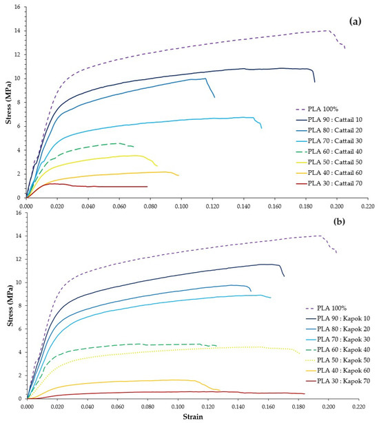 Stress–strain curves of composite webs comprising PLA bicomponent fiber mixed with (a) cattail fiber and (b) kapok fiber.