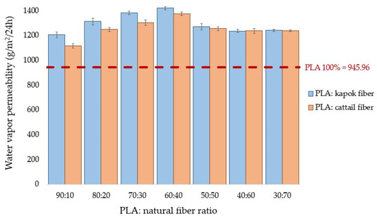 Incorporating natural fibers into the composite webs enhanced their water vapor permeability compared with 100% PLA bicomponent webs. Interestingly, composite webs made from cattail fibers exhibited lower water vapor permeability than those crafted from kapok fibers at identical ratios. Several factors influence water vapor permeability, including sample thickness; thicker samples increase the distance and time needed for water vapor to travel, resulting in reduced permeability. Despite composite webs from the kapok fibers being slightly thicker than those from cattail fibers at the same ratio, the significant lumen present in kapok fibers contributes to their higher water vapor permeability [54].