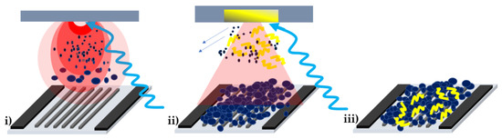 Sketch of the sensor fabrication: (i) mesoporous WO3 by PLD on interdigital electrodes; (ii) deposition of PPy layer by MAPLE on top of the WO3 mesoporous layer. The arrows indicate that the solvent molecules are pumped away from the deposition chamber, while the polymer material is deposited onto the WO3 layer; (iii) a WO3/PPy nanocomposite layer deposited onto the interdigital electrodes of a gas sensor.