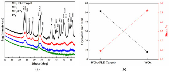 X-ray diffraction result of the active layers (a) XRD pattern of the WO3 target, WO3 thin layer, PPy thin layer, and WO3/PPy nanocomposite layers deposited by PLD and MAPLE; (b) crystallite size and strain of the WO3 target material and WO3 particles obtained by PLD. The data are obtained from the Sherrer Equation in HighScore Plus software.
