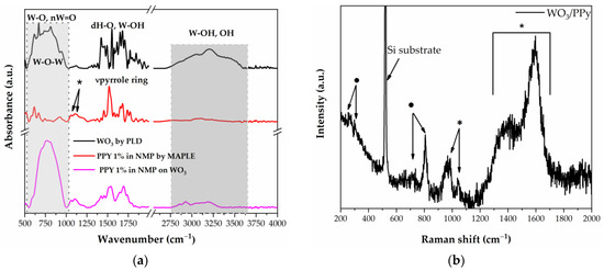 (a) FTIR spectra of WO3, PPy, and WO3/PPy nanocomposite as deposited by PLD and MAPLE. (b) Raman spectra of WO3/PPy nanocomposite. In the Raman spectra, the peaks marked with the symbol (*) are assigned to PPy polymer, whilst the peaks marked with (·) are assigned to WO3.