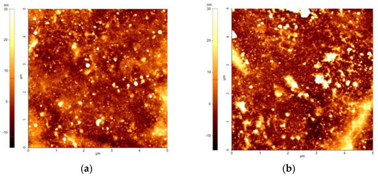 Furthermore, the PPy layer deposited by MAPLE (20 nm thickness) reveals a textured surface with a granular appearance (Figure 5c). The granules, which make up the thin layer, vary in size and are densely packed, creating a three-dimensional topography. The granular structure of the PPy thin layer is indicative of the polymer’s inherently semicrystalline nature [40].
