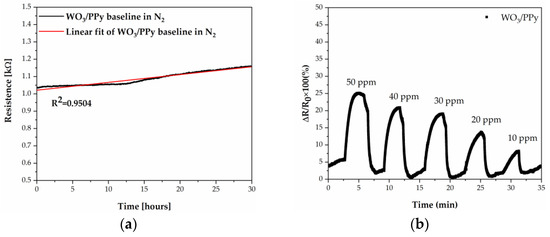 Further on, we went on to explore the sensing properties of the WO3/PPy towards NH3. Prior to evaluating the WO3/PPy sensor response to ammonia, we evaluate the baseline resistance in time (i.e., for more than 30 h of continuous measurement), at 22 ± 1 °C, in a dry N2 atmosphere, and find that it is in the range 1–2 kΩ (see Figure 8a). Moreover, the baseline demonstrates an approximately linear trend, as indicated by the high R-square value of 0.95.