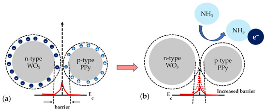 Gas-sensing mechanism for the WO3/PPy nanocomposite (a) in air and (b) when exposed to NH3. Ec denotes the energy of the conduction band.