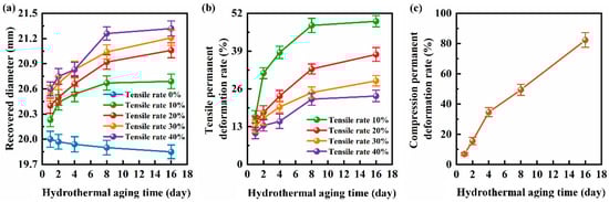 (a) The recovered diameters, (b) tensile permanent deformation rates of the NBR seals, and (c) the compression permanent deformation rates of the NBR cylindrical samples with different hydrothermal aging times.