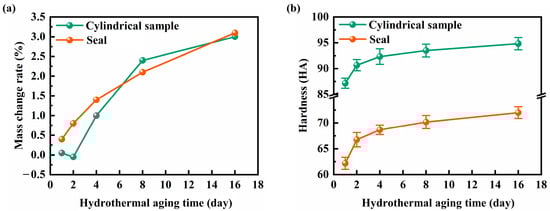The variation curves of (a) mass and (b) hardness of the NBR cylindrical samples and the NBR seals with different hydrothermal aging times.