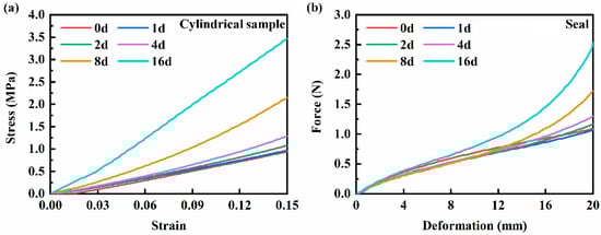 Figure 3 shows the compression stress-strain curves of the NBR cylindrical samples and the tensile force-deformation curves of the NBR seals with different hydrothermal aging times. As shown in Figure 3, the two samples showed similar trends in the compression test and tensile test; the NBR cylindrical samples and the NBR seals exhibited enhanced compressive strength and tensile strength, respectively, with the hydrothermal aging time increased. This enhanced trend became more obvious with the increase of hydrothermal aging time. The increase in the compressive strength and tensile strength of the samples is due to the increase in the crosslink density of NBR in the hydrothermal aging environment [,]. The degree of connection between the molecular network chains is enhanced, and more molecular chains bear stress during compression or stretching. In addition, the increase in the degree of crosslink between molecules leads to the shortening of the molecular chain and the deformation amount of the NBR decreases when subjected to stress. The other test data are shown in Figure S5.