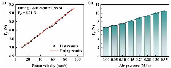 (a) The Ff-piston velocity variation curves and fitted curves of the cylinder equipped with the 0 d NBR seals; (b) the FC of the cylinder equipped with the 0 d NBR seals with different loading air pressure.