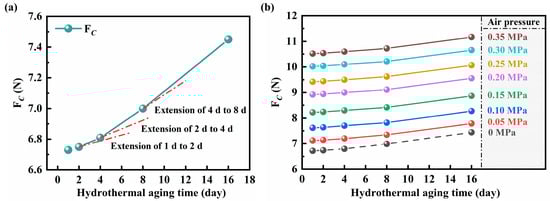 The friction tests were conducted on cylinders equipped with the aged NBR seals at different velocities in 0 MPa, and the results are shown in Figure S6. The curves were fitted by the least squares method, using Equation (6), in order to obtain the variation curve of FC with the hydrothermal aging times, as shown in Figure 6a. It can be observed that the FC increases not linearly with the increase of hydrothermal aging time at the loading air pressure of 0 MPa. According to the extension line, the incremental rate of FC increases gradually with the increase of hydrothermal aging time, which indicates that the relationship between hydrothermal aging time and FC shows an exponential change, and the increase of hydrothermal aging time leads to a faster decrease of tribological performance of the NBR seals. As shown in Figure 6b, the FC increases with the loading air pressure, which does not change due to hydrothermal aging. Moreover, the variation trend of FC with hydrothermal aging time does not change with the loading air pressure. This indicates that the loading air pressure does not affect the effect of hydrothermal aging on the tribological performance of the NBR seals in the cylinder during service, which only generates greater friction during the cylinder motion.
