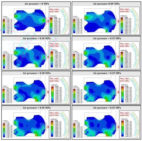 The Mises stress clouds and shear stress (CSHEAR1) distribution of the 0 d NBR seals under different loading air pressures.