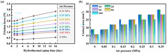 (a) The frictional force and (b) the contact area of the aged NBR seals under different loading air pressures.