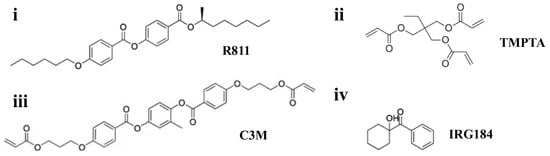 Molecular structures of chiral dopant, monomers, and photo-initiator. (i) R811, (ii) TMPTA, (iii) C3M, (iv) IRG184.