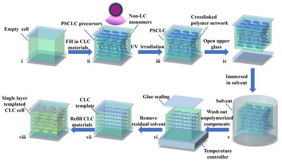 Schematic illustration of the CLC arrangements in the single-layer cell. (i) Empty cell, (ii) PSCLC precursors in cell under UV irradiation, (iii) PSCLC sample, (iv) opening the upper glass substrate of cell, (v) bottom substrate with PSCLC immersed in solvent, (vi) removing residual solvent and combining the upper substrate with bottom substrate with template, (vii) template of sample, (viii) cell after refilling material into the template.