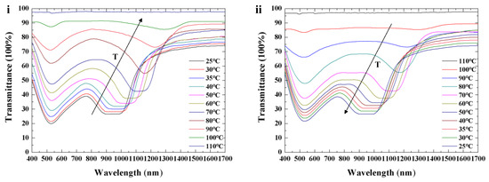 The transmission spectra shown in Figure 5 indicate simultaneous visible and infrared reflections from the cell. The spectral shifts of the two reflection bands as a function of temperature are visualized. Figure 5i illustrates transmission spectra of Cell 1 upon heating, and Figure 5ii shows transmission spectra of Cell 1 upon cooling. The reflection peak red shifts from 950 nm to 1305 nm when temperature increases from 25 °C to 100 °C. The transmittance decreases from 45% initially until the mixture reaches an isotropic state as the temperature increases. Temperature () dependence of pitch () [16,35,36] can be given by