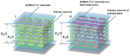 Pitch modulation of CLCs in a single-layer templated cell upon thermal activation. (i) Pitch of refilled material and template at initial temperature (PR, pitch of refilled material; PT, pitch of template). (ii) Longer pitch of refilled material and constant pitch of template at a high temperature (PR′, pitch of refilled material at a high temperature).